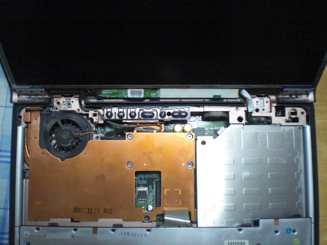 電源があるパネルを裏からドライバーでねじを外してから(2箇所)、マイナスドライバーでこじ開けるように外す。蝶番のカバーもマイナスドライバーで外すとヒンジとコードが見えてくる。 この段階でキーボードのパネルも外せます。蝶番側から持ち上げると簡単に外れます。プリント配線がつながっているのでストッパーを少し持ち上げるとすぐ抜けます。